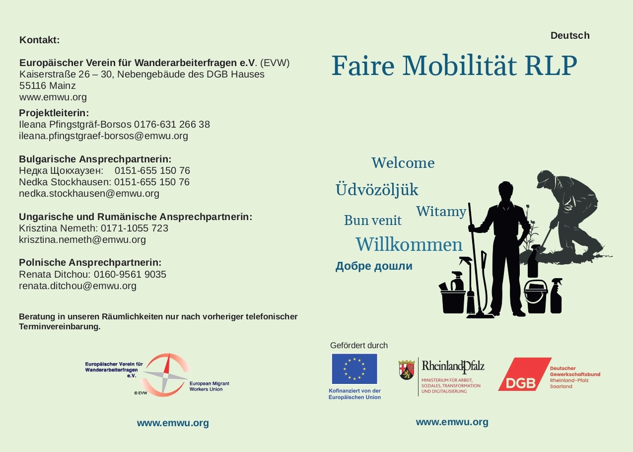 Der Europäische Verein für Wanderarbeiterfragen e.V. (EVW) führt in Rheinland-Pfalz das Projekt „Faire Mobilität RLP“ durch. Das Projekt wird im Jahr 2026 durch das Ministerium für Arbeit, Soziales, Transformation und Digitalisierung Rheinland-Pfalz, aus Mitteln der Europäischen Sozialfonds Plus und durch DGB Rheinland-Pfalz/Saarland gefördert. Es trägt dazu bei, die Arbeitsmarktpolitik des Landes Rheinland-Pfalz umzusetzen.