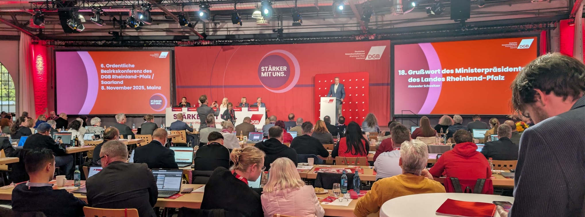 Am 08.11.2025 fand in Mainz die 6. Ordentlichen Bezirkskonferenz des DGB Rheinland-Pfalz/Saarland statt. An der Veranstaltung nahmen zwei Beraterinnen vom Projekt Faire Mobilität RP 2025 teil. Der Europäische Verein für Wanderarbeiterfragen e.V. wurde als Aussteller eingeladen, zusammen mit anderen gewerkschaftsnahe Organisationen. Die Konferenz stand unter dem Motto „Gemeinsam mit uns“ und brachte Delegierte mehrerer Gewerkschaften und Vertreter der Politik aus Rheinland-Pfalz und aus dem Saarland zusammen. In den Vorträgen legte die DGB den Akzent auf eine starke Wirtschaft und gute Arbeitsbedingungen, sowie auf die Notwendigkeit eines starken Sozialstaats.