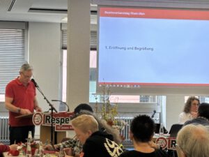 Bereits zu Beginn der Veranstaltung wurden Verlislava Firova (EVW) und Justyna Oblacewicz (FM Bund) persönlich vom ehemaligen Bezirksvorsitzenden, Herrn Bruno Wahl, begrüßt. In seiner Rede betonte er die Bedeutung der Arbeit von Faire Mobilität an sich sowie die Bedeutung der Zusammenarbeit mit der IG BAU.